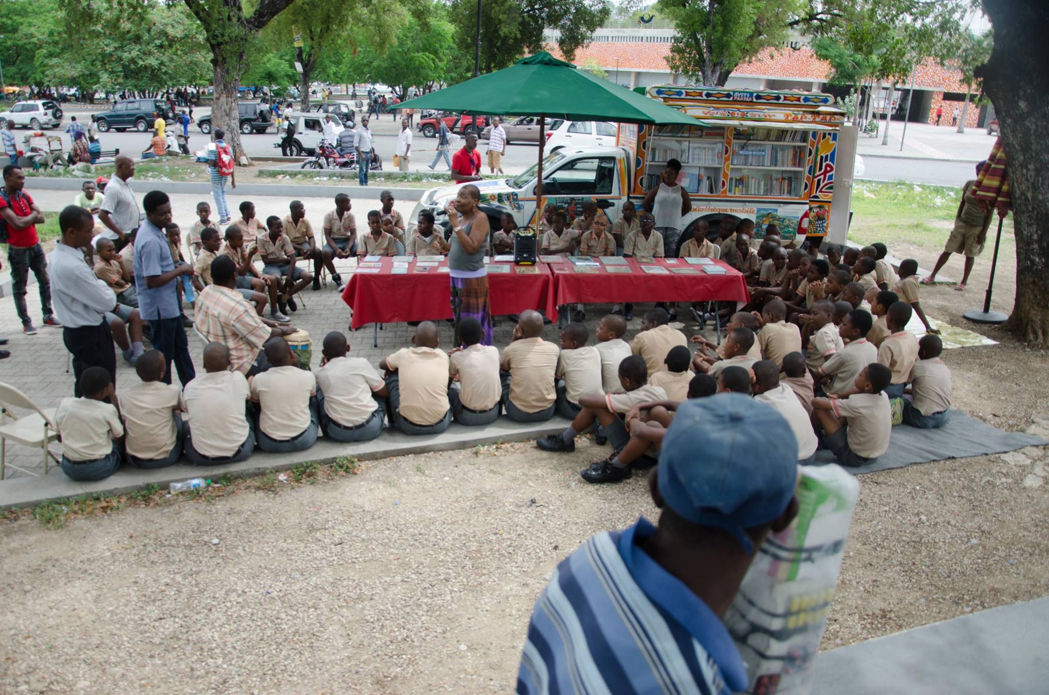 Bibliothèque mobile, le bibliotaptap était destiné à offrir des activités de lecture et d’animation dans les espaces publics, places, marchés, et dans des écoles. Il a été créé sur une idée du directeur de Bibliothèques sans frontières (BSF), à la suite du tremblement de terre qui a détruit les rares bibliothèques qui fonctionnaient encore. BSF s’était engagé à appuyer la création de trois bibliotaptaps qui devaient être pris en charge par les institutions respectives : FOKAL, la Direction nationale du livre (DNL) et la Bibliothèque nationale d’Haïti (BNH). Seule FOKAL a maintenu les services de notre bibliotaptap jusqu’à 2019. Avec la montée de l’insécurité, les visites n’étant plus possible, nous avons dû en sécuriser le contenu. Le véhicule taptap qui fut transformé en bibliothèque se trouvait dans le parking de FOKAL. Il a été volé par les gangs armés lorsqu’ils ont envahi les bureaux de FOKAL à l’avenue Christophe en mars 2025.