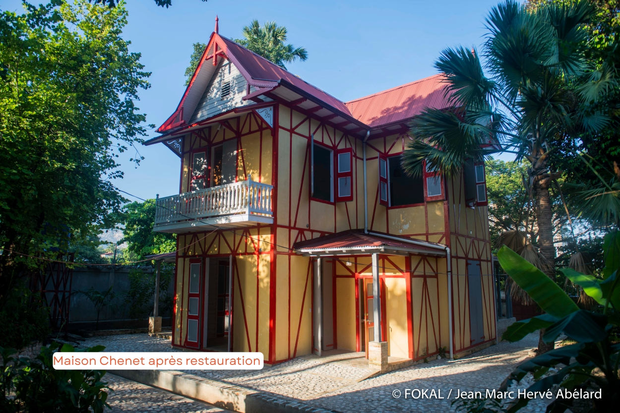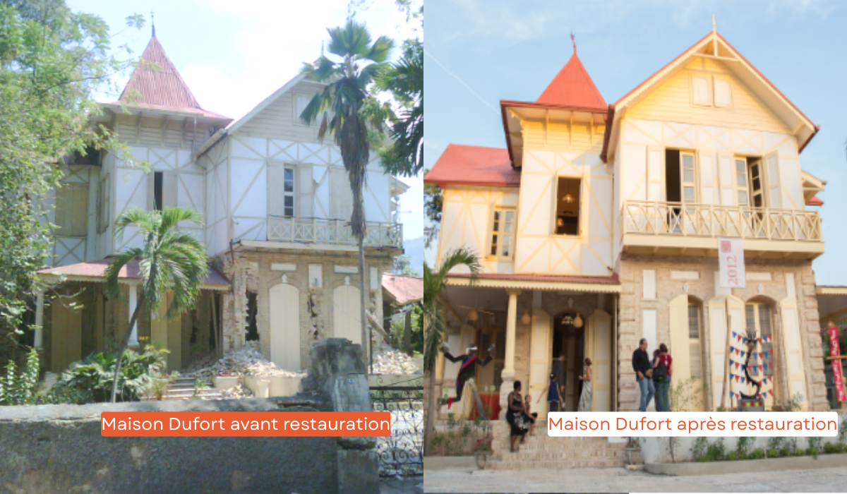 La possibilité de faire l’acquisition d’une maison gingerbread s’est présentée, et c’est ainsi que FOKAL est devenue propriétaire de la maison Dufort à la 3ème Avenue du Travail. La création du chantier-école a pu se concrétiser dans le but de développer les compétences dans ce domaine. En mai 2011, FOKAL a reçu une mission d’exploration de l’Institut du Patrimoine Wallon et une mission d’appui du World Monuments Fund pour la mise en place des formations. En novembre 2011 une première session de formation sur la chaux a été réalisée avec un formateur de l’Institut du Patrimoine Wallon pour un groupe d’une quinzaine de jeunes techniciens en bâtiment de quatre centres professionnels : Centre Pilote, Haiti Tec, Canado Technique et Sainte-Trinité. Le processus de restauration de la maison Dufort était lancé. Il aura duré quatorze mois.